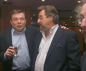 Председатель Совета директоров "Альфа-Групп" Михаил Фридман (слева), вице-президент "Альфа-банка" Александр Гафин (в центре) и писатель-сатирик Михаил Жванецкий (справа) во время торжественного приема, посвященного празднованию Хануки (Праздник Освящения). Прием прошел в гостинице "Рэдиссон Славянская".
