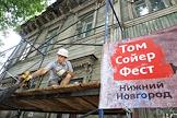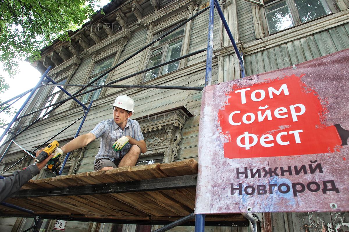 Фестиваль реставрации старинных построек "Том Сойер фест". Волонтеры восстанавливают деревянный дом по улице Короленко, д.18.