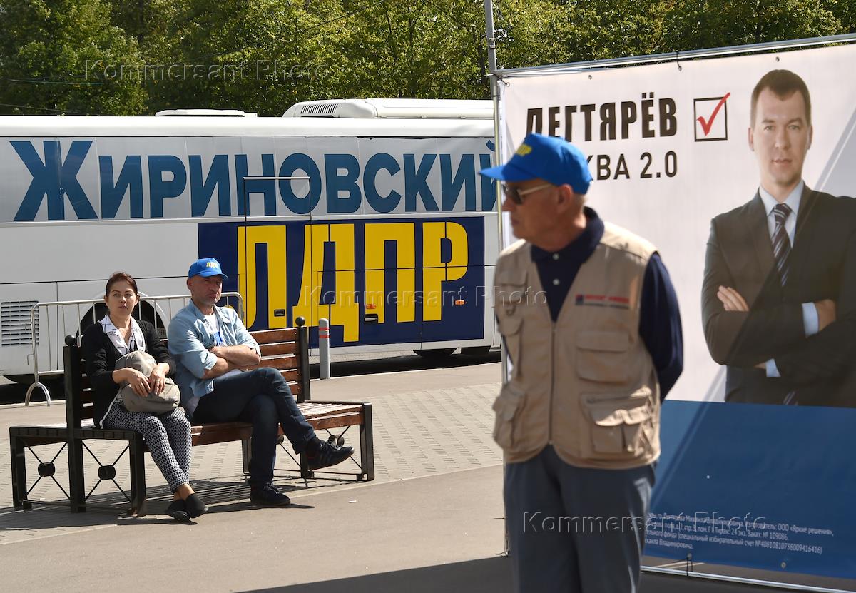 Митинг Либерально-демократической партии России (ЛДПР), посвященный Дню Государственного флага России на площади Сокольнической заставы. Жанровая фотография. Рекламный плакат председателя комитета Государственной думы России по физической культуре, спорту, туризму и делам молодежи, кандидата на выборах мэра Москвы Михаила Дегтярева.