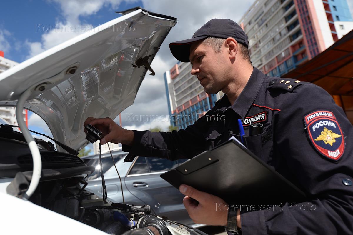 Работа отделения регистрации межрайонного отдела ГИБДД технического надзора и регистрационно-экзаменационной работы № 2 государственного управления МВД России по городу Москве. Сотрудник полиции во время проверки автомобиля.