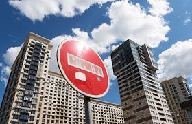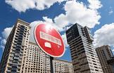 Жанровая фотография. Знак "проезд запрещен" на фоне новых многоэтажных жилых домов.