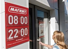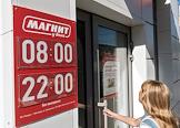 Жанровая фотография. Женщина перед входом в магазин "Магнит". Вывеска с режимом работы магазина.