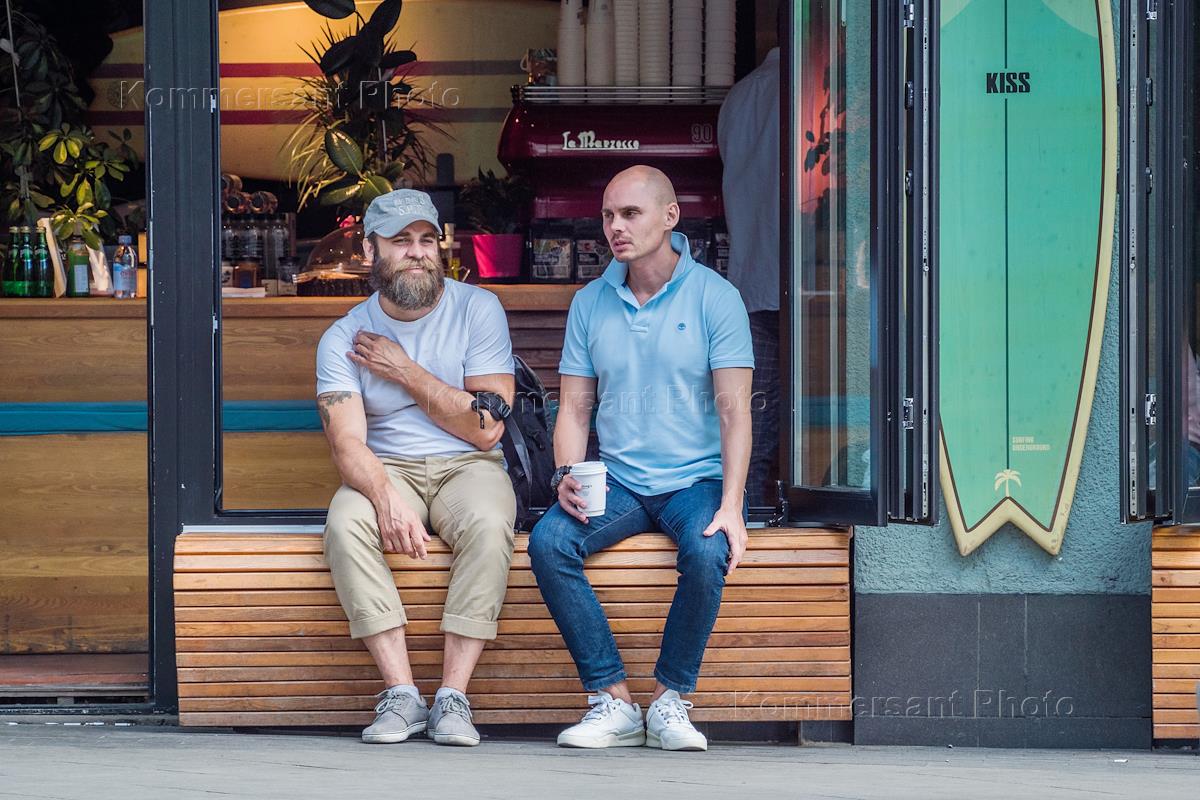 Жанровая фотография. Молодые люди катаются на самокатах по набережной.