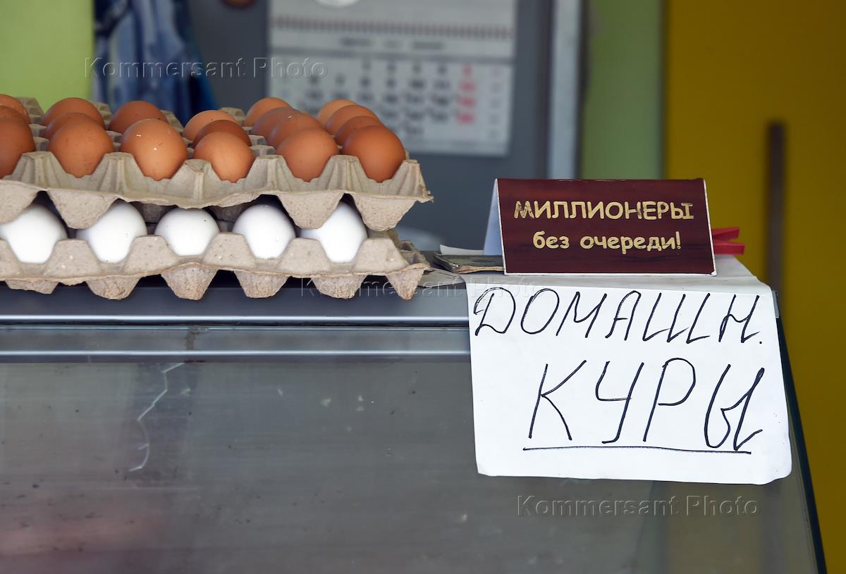 Жанровая фотография. Яйца в ячейках на прилавке магазина.