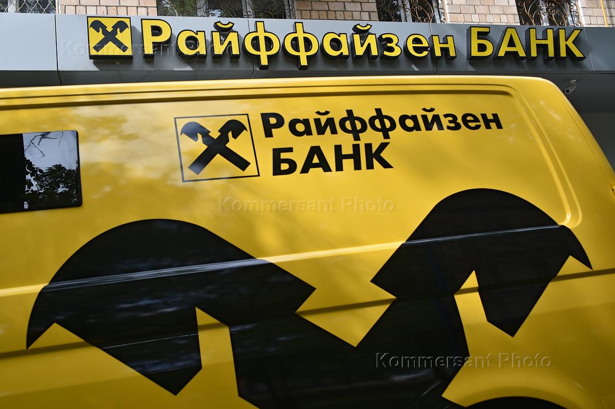 Жанровая фотография. Автомобиль с логотипом Райффайзенбанка, припаркованный у офиса Райффайзенбанка.