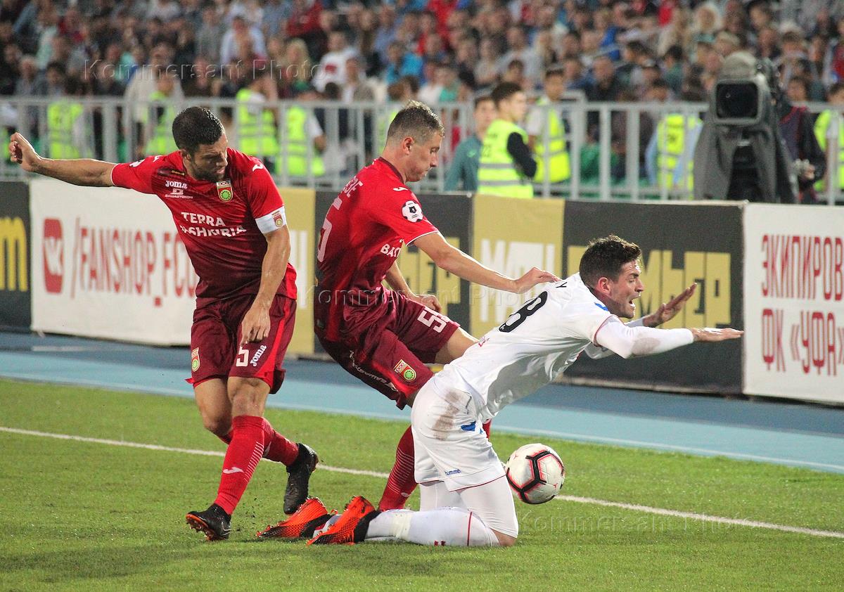 UEFA League 2018/2019. Play-off stage. Second match between Ufa football team (Ufa, Russia) and Rangers football team (Glasgow, Scotland) at Neftyanik stadium. Ufa football players Bojan Jokic and Dzhemal Tabidze with Rangers football player Kyle Lafferty (right) during the match.