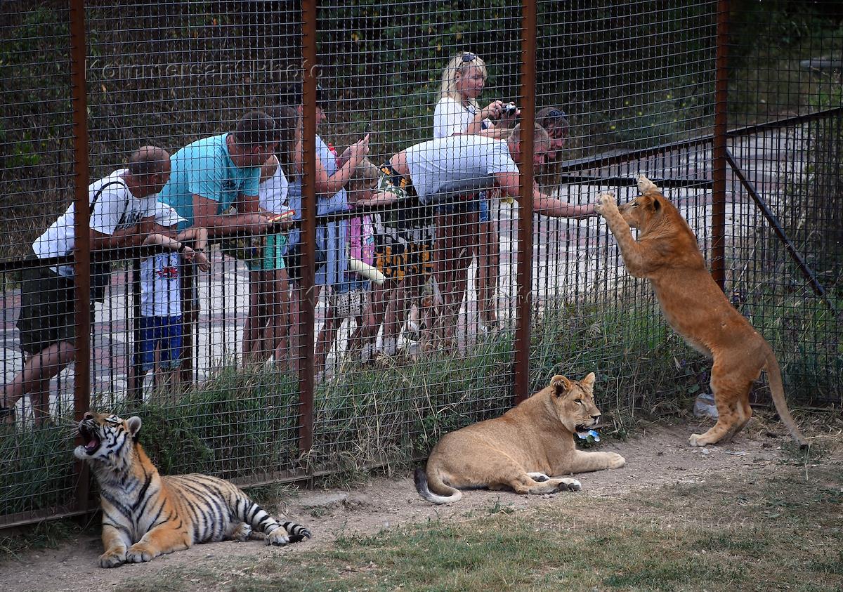 Парк львов "Тайган" - крупнейший в Европе питомник львов и других видов животных. Посетители у вольера с тиграми и львицами.