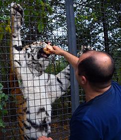Парк львов "Тайган" - крупнейший в Европе питомник львов и других видов животных. Посетитель кормит тигра.