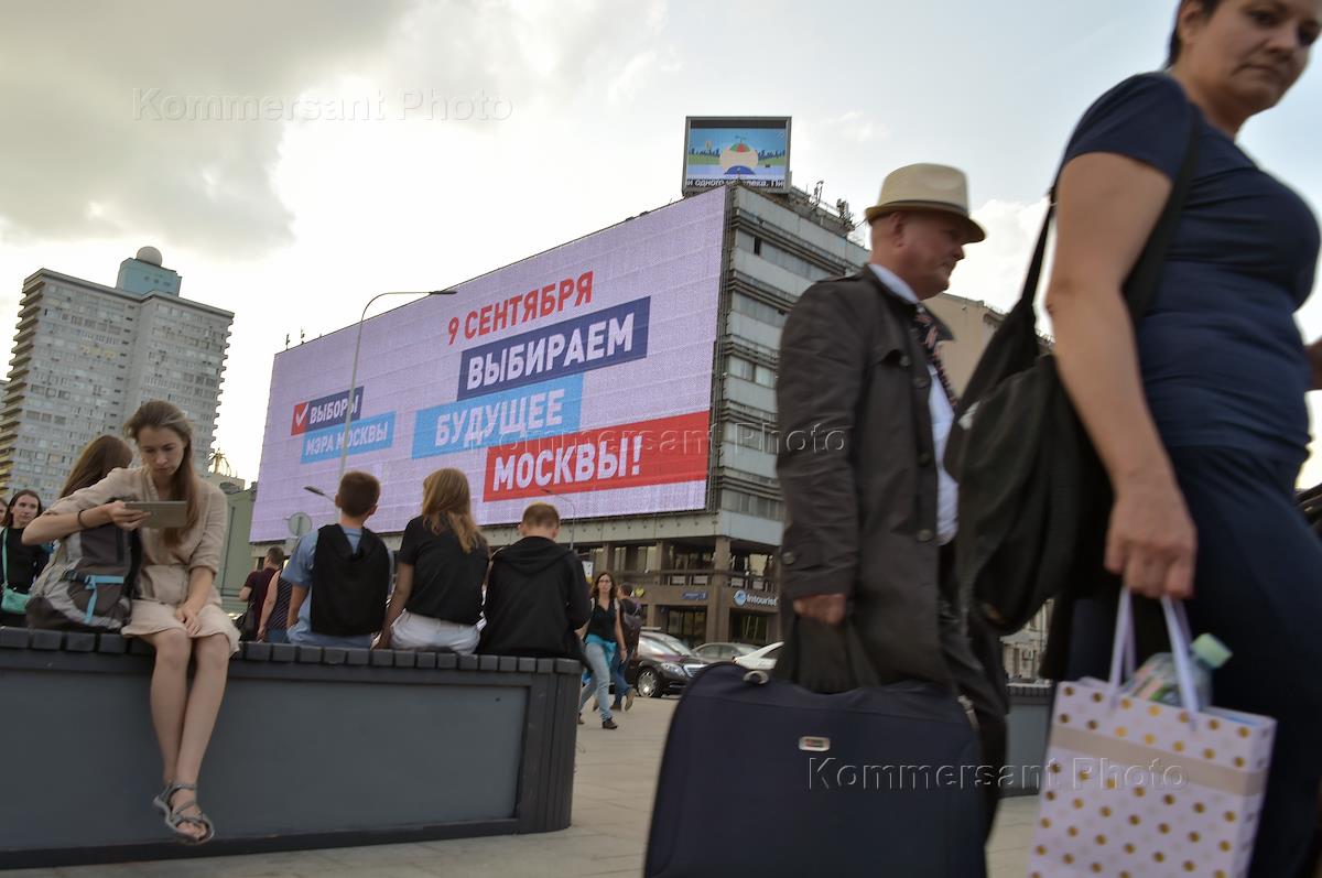 Предвыборная кампания по выборам мэра Москвы. Информационный плакат о дате выборов на улице города.