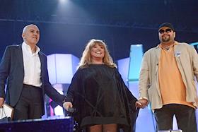 Музыкальные продюсеры Игорь Матвиенко (слева), Максим Фадеев (справа) и певица Алла Пугачева (в центре) на заключительном концерте телевизионного проекта Первого канала "Фабрика звезд - 5". Концерт прошел в спортивном комплексе "Олимпийский".