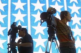 Телеоператоры во время съемки заключительного концерта телевизионного проекта Первого канала "Фабрика звезд - 5". Концерт прошел в спортивном комплексе "Олимпийский".