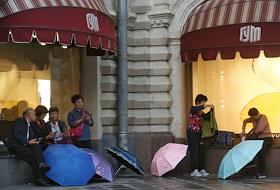 Жанровая фотография. Азиатские туристы сидят на ограждении витрины ГУМа на Красной площади.
