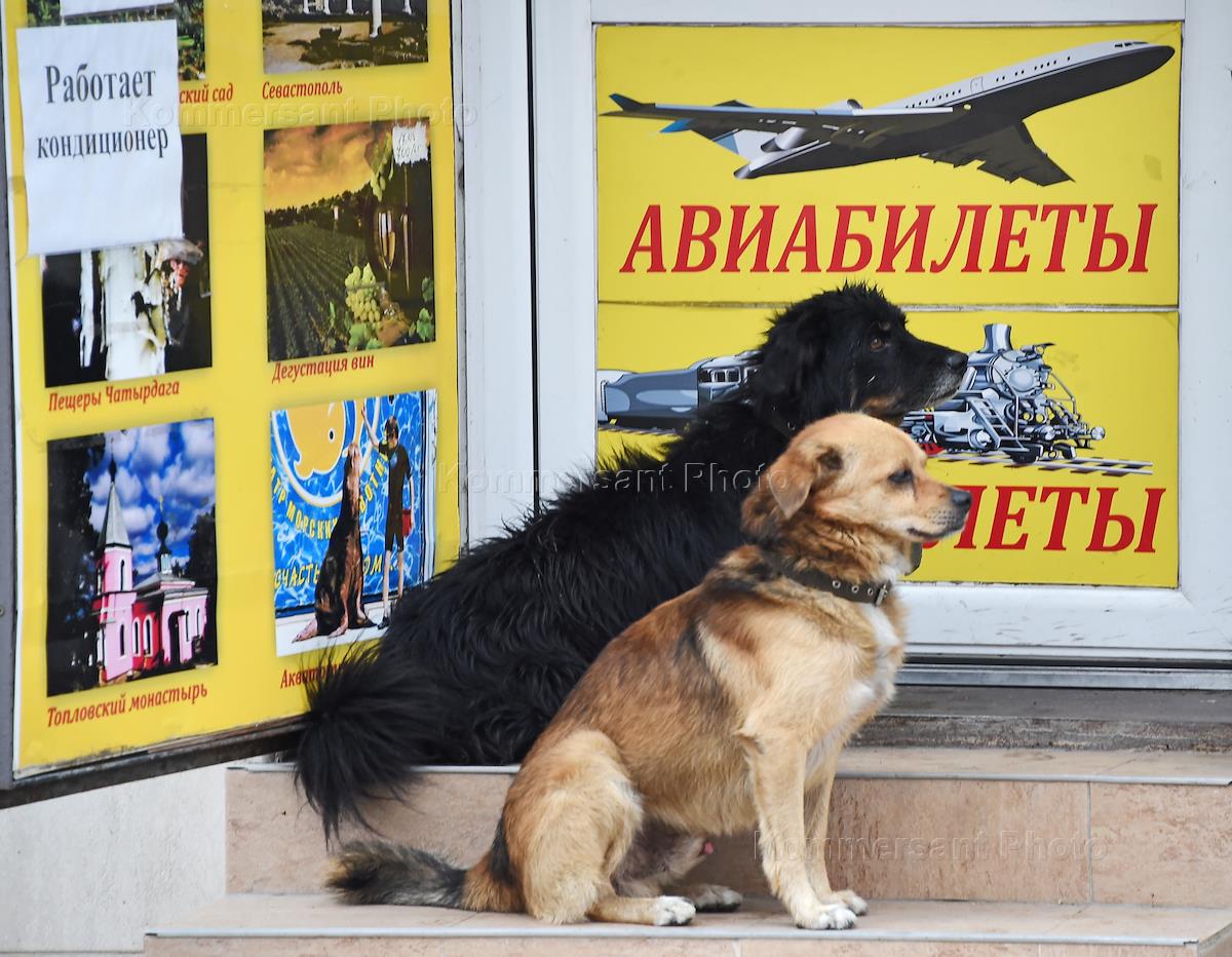 Жанровая фотография. Две собаки сидят перед офисом туристической фирмы.