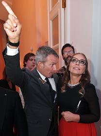 Прием, посвященный открытию выставки "Bvlgari. Очарование женственности. Великолепие римских драгоценностей", прошел в Доме Пашкова. Главный редактор журнала "Tatler" Ксения Соловьева (слева) и телеведущий Андрей Малахов (справа) во время приема.