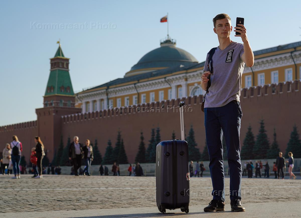 Genre photo. A tourist withhis bag on Red Square takes a photo on a cell phone.