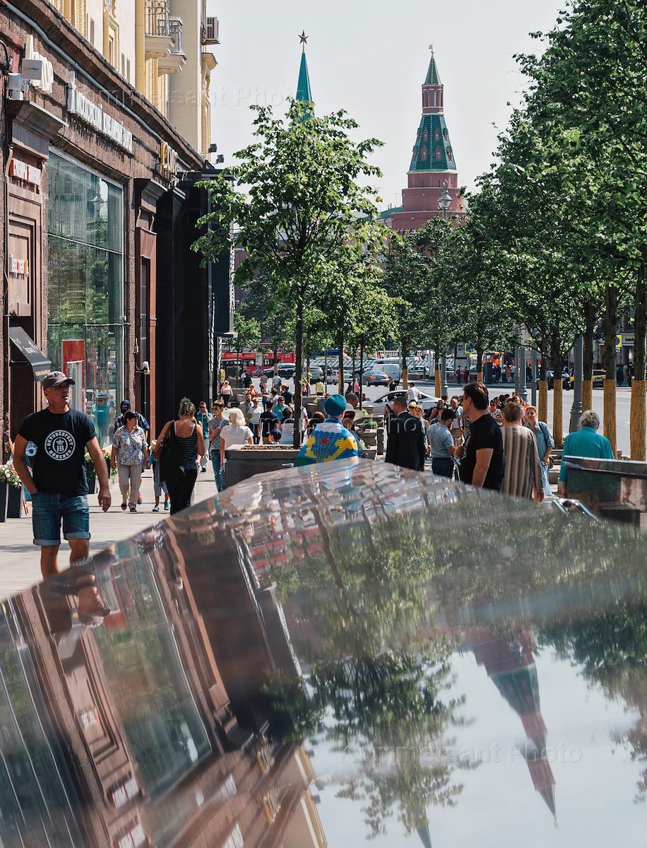 Views of Moscow. Visitors of the Zaryadye park on the Floating bridge, right, and The Cathedral of the Intercession of the Most Holy Theotokos on the Moat (Cathedral of Vasily the Blessed) on Red Square, left.