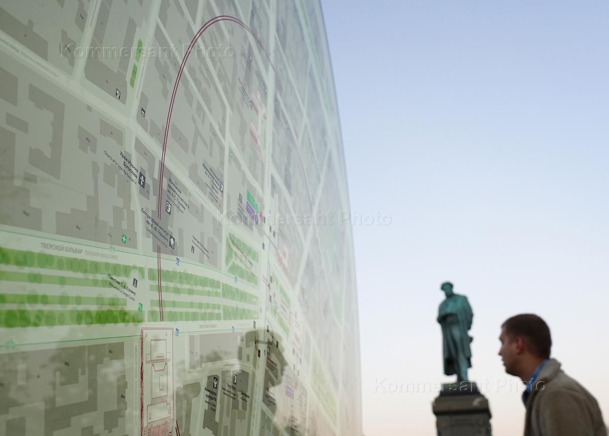 Genre photo. A man stands by a map of Moscow board near the Monument to Alexander Pushkin.