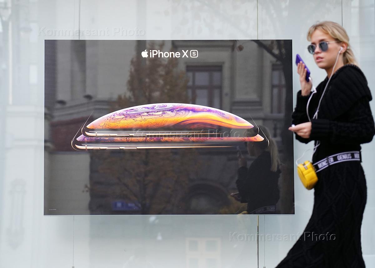Жанровая фотография. Девушка с мобильном телефоном идет у рекламного плаката мобильного телефона компании Apple iPhone Xs.