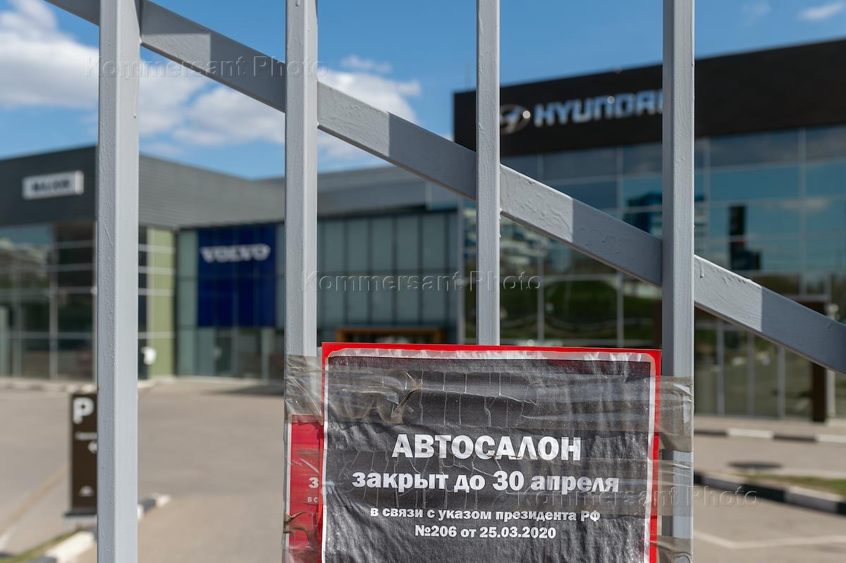 Moscow during self-isolation regime caused by the danger of the coronavirus COVID-19 spread. Genre photo. Sign on the gates informing about the closure of the dealership.