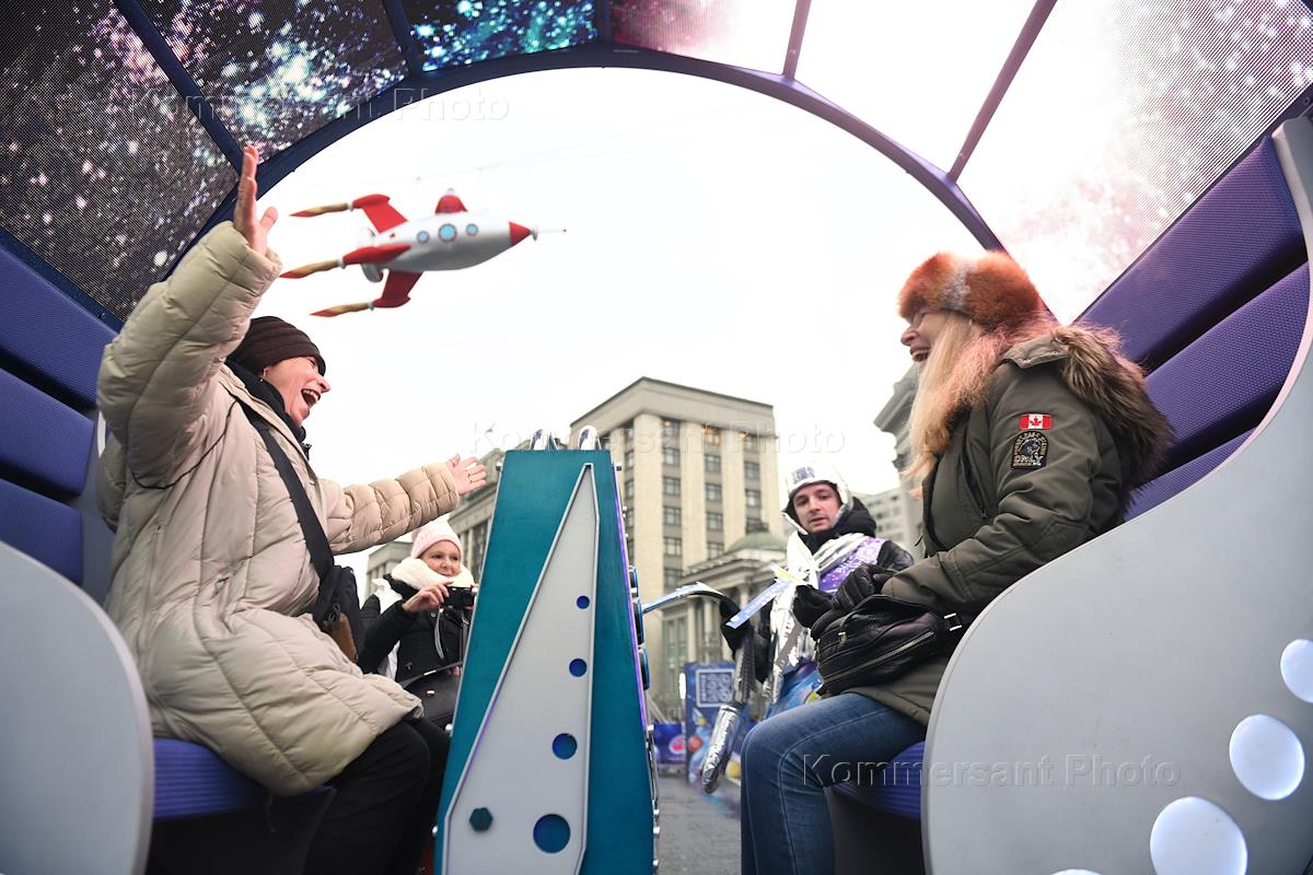 Genre photo. Journey to Christmas Festival. Game pavilions on Manezhnaya Square.