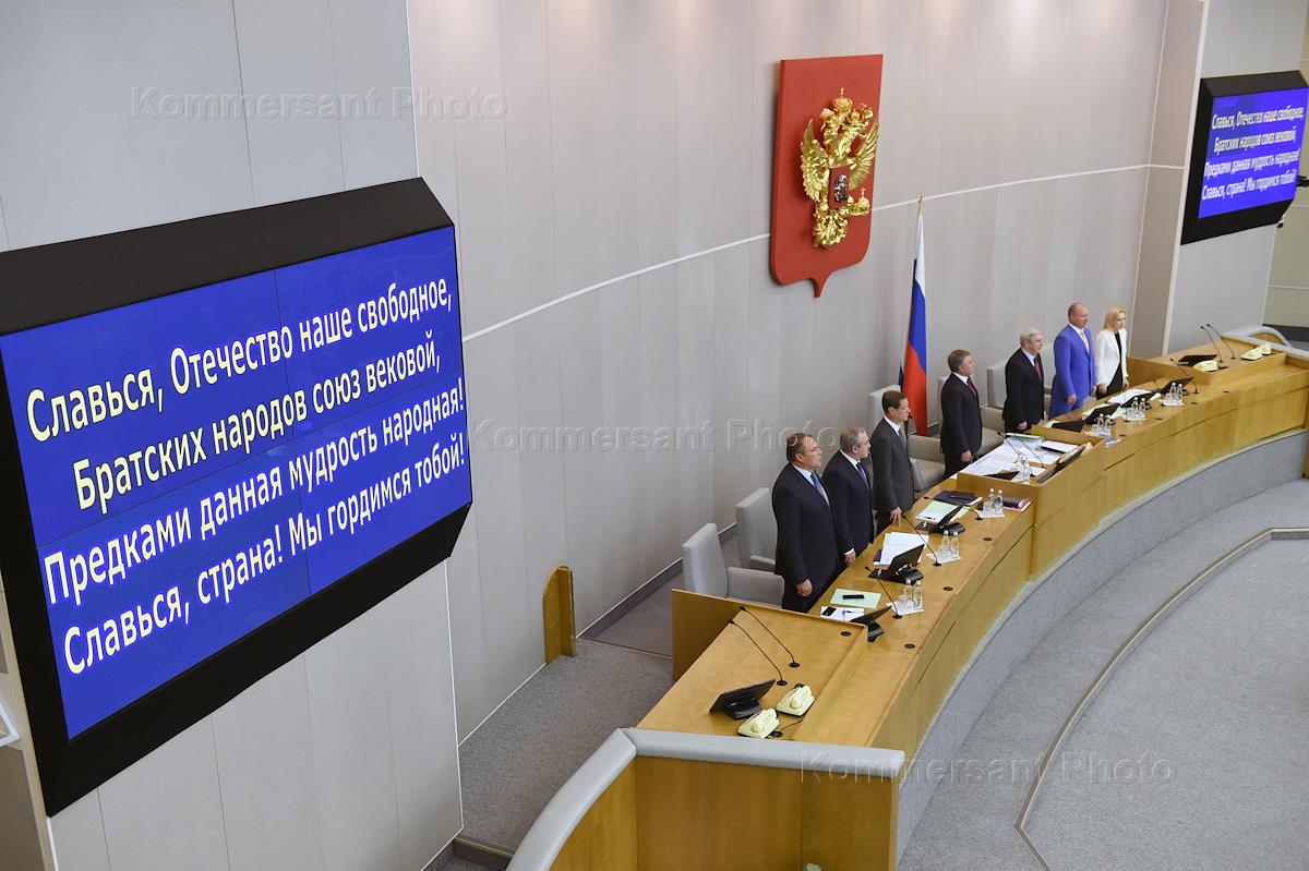 Пленарное заседание Государственной думы (ГД) России. Депутаты ГД России во время исполнения Гимна России на заседании.