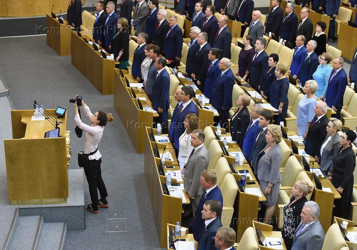 Пленарное заседание Государственной думы (ГД) России. Депутаты ГД России во время исполнения Гимна России на заседании.