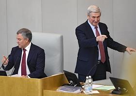 Пленарное заседание Государственной думы (ГД) России. Председатель ГД России Вячеслав Володин (справа) и его первый заместитель Иван Мельников (слева) перед началом заседания.