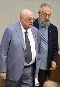 Пленарное заседание Государственной думы (ГД) России. Член комитета ГД России по транспорту и строительству Владимир Ресин (слева) и член комитета ГД России по международным делам Артур Чилингаров (справа) перед началом заседания.