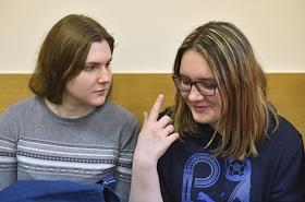 Фигуранты уголовного дела об экстремизме - члены организации "Новое величие" Анна Павликова (слева) и Мария Дубовик (справа) во время ходатайства следственных органов о продлении сроков их ареста в Дорогомиловском районном суде.