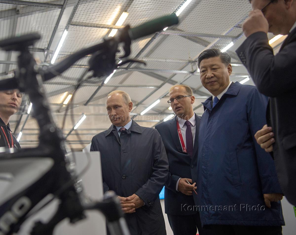 Рабочая поездка президента России Владимира Путина во Владивосток. Председатель КНР Си Цзиньпин (справа) и президент России Владимир Путин (слева ) во время посещения выставки "Улица Дальнего Востока" в рамках IV Восточного экономического форума.