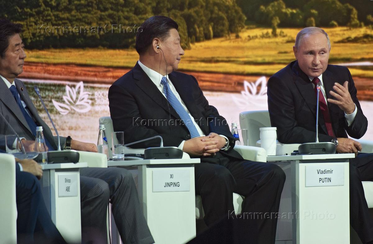 Рабочая поездка президента России Владимира Путина во Владивосток. IV Восточный экономический форум (ВЭФ) 2018. День второй. Слева направо: премьер-министр Японии Синдзо Абэ, председатель Китайской Народной Республики (КНР) Си Цзиньпин и президент России Владимир Путин на пленарном заседании "Дальниий Восток: расширяя границы возможностей".