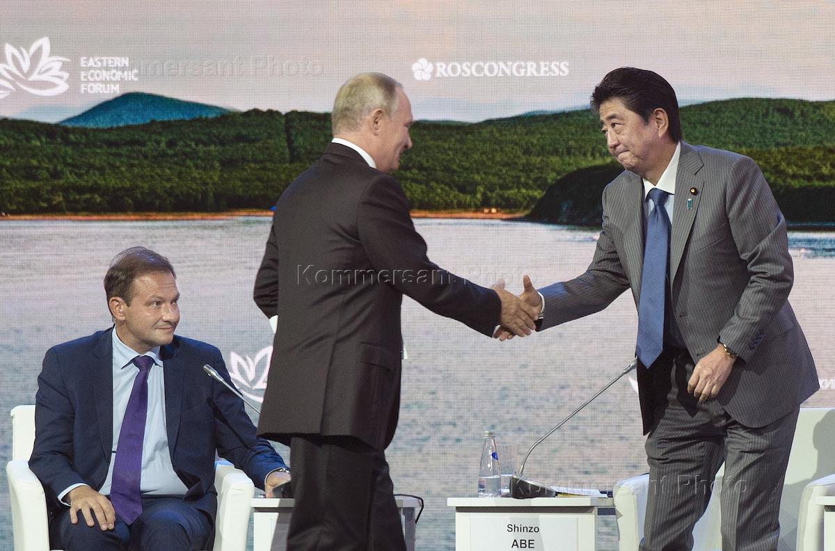 Рабочая поездка президента России Владимира Путина во Владивосток. IV Восточный экономический форум (ВЭФ) 2018. День второй. Слева направо: телеведущий, заместитель директора ГТК "Телеканал "Россия"" Сергей Брилев, президент России Владимир Путин и премьер-министр Японии Синдзо Абэ на пленарном заседании "Дальниий Восток: расширяя границы возможностей".