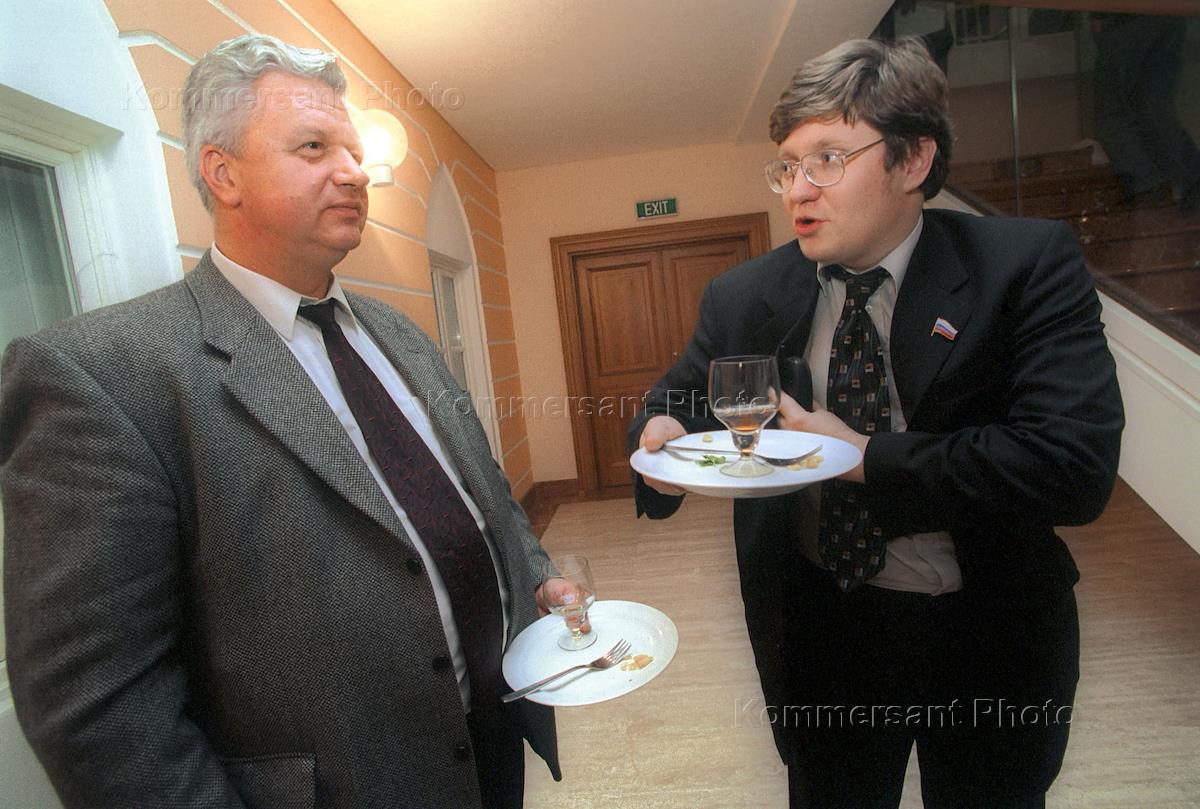 Руководитель Фонда эффективной политики, имиджмейкер Глеб Павловский (справа) и шеф-редактор газеты "Страна.Ru" М.Литвинович (слева) на презентации нового проекта Фонда - национальная информационная служба "Страна.Ru" в "Александр-хаус".