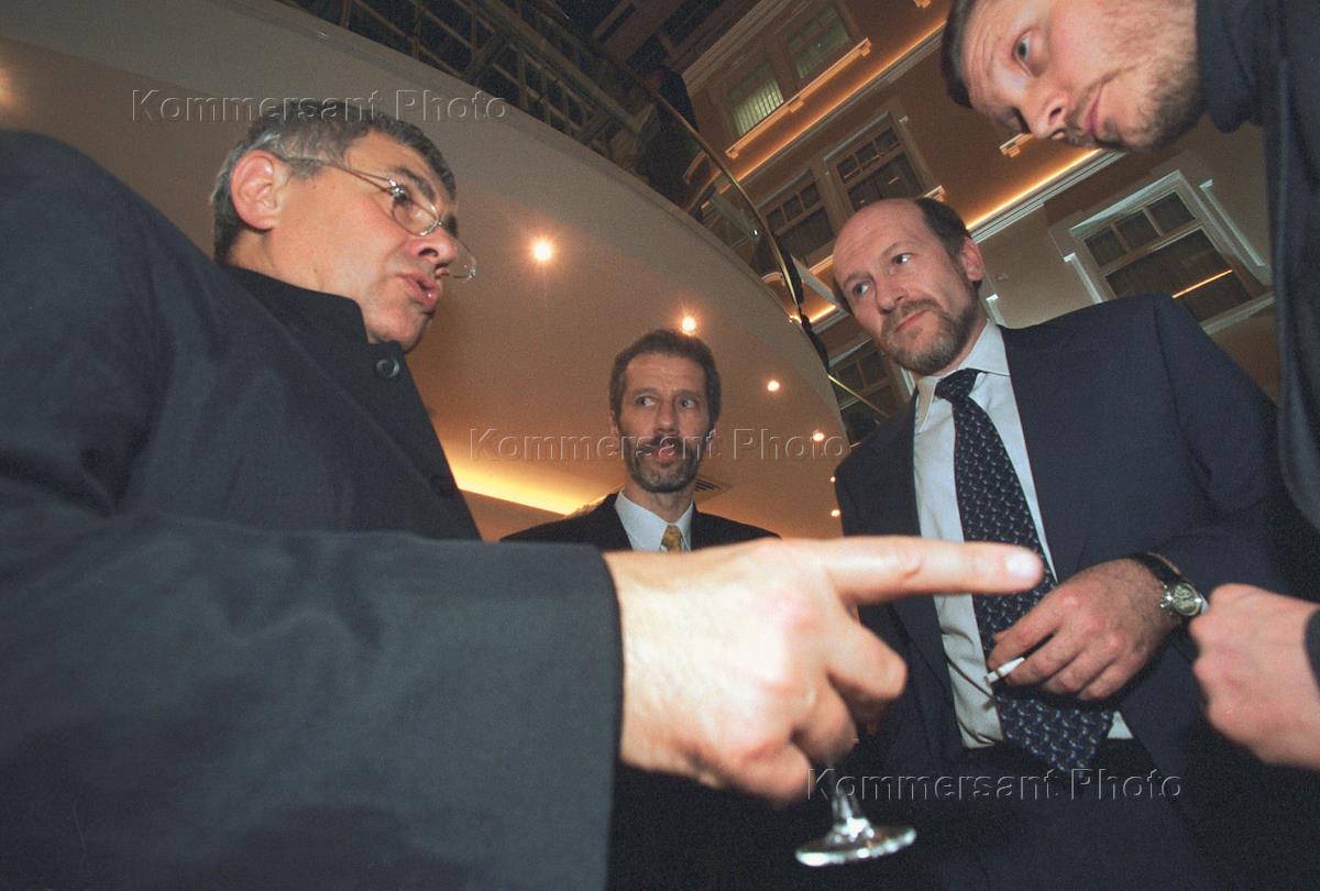 Руководитель Фонда эффективной политики, имиджмейкер Глеб Павловский (слева) и руководитель администрации Президента России Александр Волошин (второй справа) на презентации нового проекта Фонда - национальная информационная служба "Страна.Ru" в "Александр-хаус".