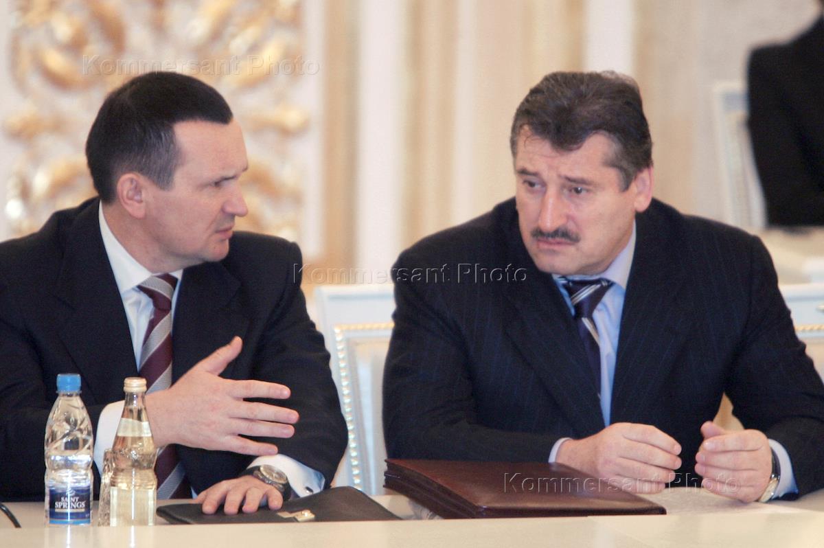 Полномочный представитель Президента России в Южном административном округе Дмитрий Козак (слева) и председатель Правительства России Михаил Фрадков (справа) перед началом заседания Государственного Совета России в Александровском зале Большого Кремлевского дворца.