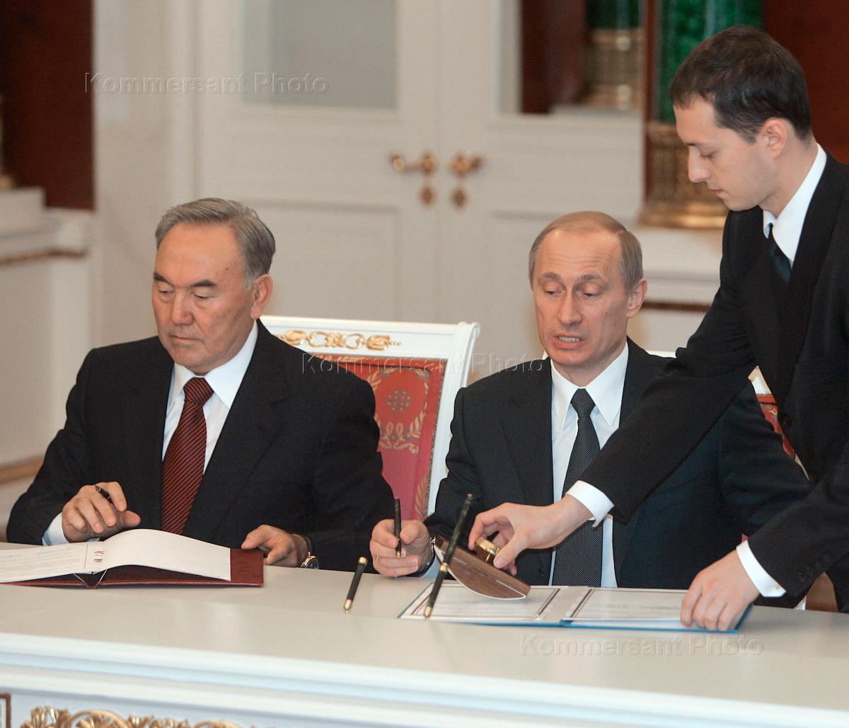 Russian President Vladimir Putin (centre) meets his counterpart Nursultan Nazarbayev (left) of Kazakhstan. The presidents attended the signing of the intergovernmental agreements on the creation of Kazakhstan's communications and broadcasting satellite, Kazsat, and on the mutual protection of the rights to the products of intellectual activities used and obtained during bilateral military and technical cooperation.