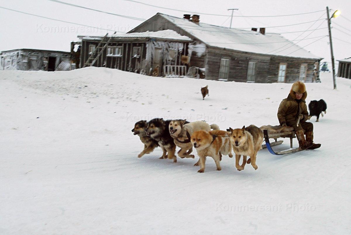 Местный житель на собачьей упряжке на острове Колгуев Ненецкого автономного округа.
