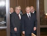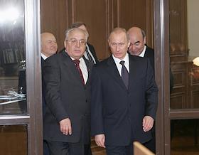 Ректор Московского Государственного университета (МГУ) им. М.В.Ломоносова Виктор Садовничий (слева), Президент России Владимир Путин (в центре) и президент Киргизии Аскар Акаев (справа) на торжественной церемонии открытия нового здания Фундаментальной библиотеки Московского государственного университета имени М.В.Ломоносова.