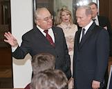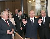 Ректор Московского Государственного университета (МГУ) им. М.В.Ломоносова Виктор Садовничий (в центре) и Президент России Владимир Путин (слева) на торжественной церемонии открытия нового здания Фундаментальной библиотеки Московского государственного университета имени М.В.Ломоносова.