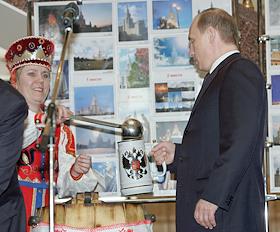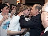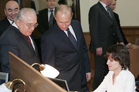 Ректор Московского Государственного университета (МГУ) им. М.В.Ломоносова Виктор Садовничий (слева), заместитель руководителя Администрации Президента России Джахан Поллыева (вторая слева), Президент России Владимир Путин (в центре) и президент Киргизии Аскар Акаев (справа) на торжественной церемонии открытия нового здания Фундаментальной библиотеки Московского государственного университета имени М.В.Ломоносова.