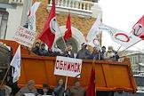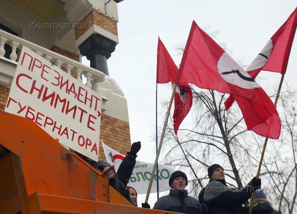 Митинг и пикет жителей города Обнинска и представителей общественных организаций и политических партий против отмены выборов мэров в Калужской области. Митинг прошел перед представительством Калужской области. Участники митинга с флагами партии "Яблоко", "Союз правых сил" и Национал-большевистской партии (НБП).