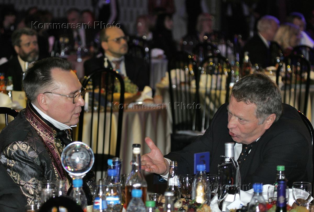 Модельер Вячеслав Зайцев (слева) и лидер ЛДПР, заместитель председателя Государственной думы России Владимир Жириновский (справа) на церемонии вручения премии "Стиль года 2004". Церемония прошла в Государственном центральном концертном зале (ГЦКЗ) "Россия".