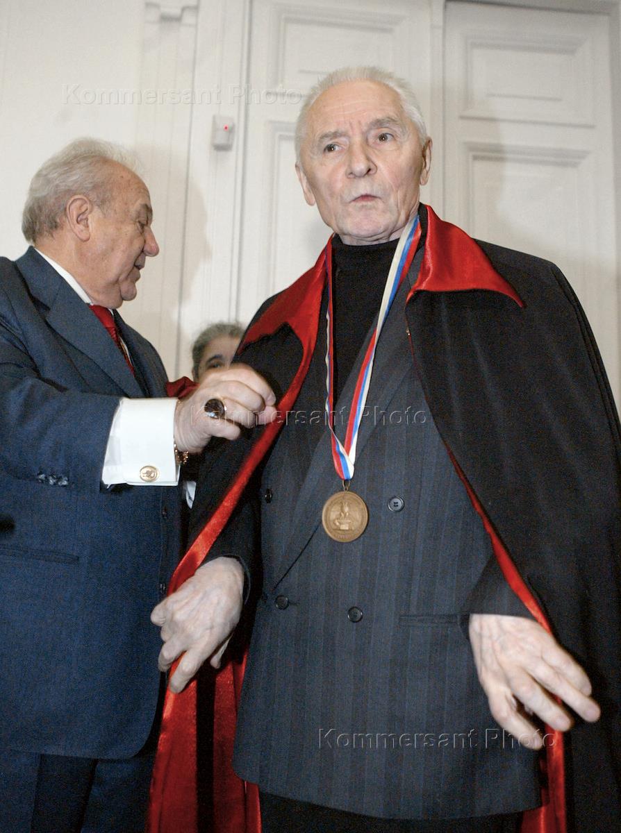 Торжественная церемония вручения памятных знаков и мантий вновь избранным почетным членам Российской академии художеств в Российской академии художеств. Балетмейстер Юрий Григорович (справа) и руководитель Федерального агенства по культуре и кинематографии Михаил Швыдкой (в центре) во время церемонии.