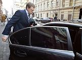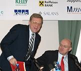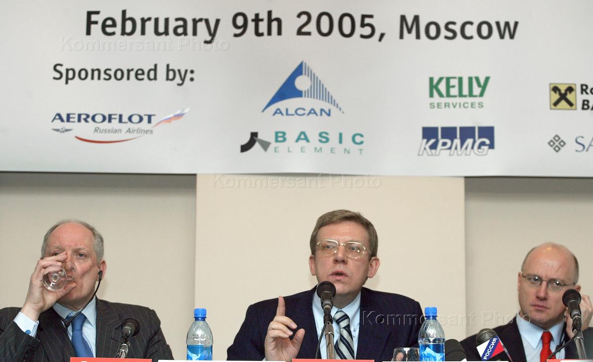 Председатель аудиторской фирмы "КПМГ - Россия и СНГ" Роджер Манингс (слева), министр финансов России Алексей Кудрин (в центре) и старший вице-президент исследовательского центра группы Economist Дэниэл Торнилей (справа) во время дискуссии "Экономические и финансовые перспективы России" в рамках конференции "Роль России в международном бизнесе". Дискуссия состоялась в "Марриотт Гранд отеле".