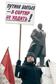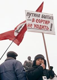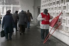 Участник Всероссийской акции протеста против монетизации льгот, за смену социально-экономического курса в интересах народа, организованной Коммунистической партией России (КПРФ), у станции метро Октябрьская. Акция прошла на Калужской площади.