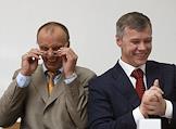 Заместитель председателя Комитета Государственной Думы России по законодательству Владимир Буткеев (слева) и председатель Российской партии пенсионеров (РПП) Валерий Гартунг (справа) во время проведения Съезда партии. Съезд прошел в гостиничном комплексе "Измайлово".