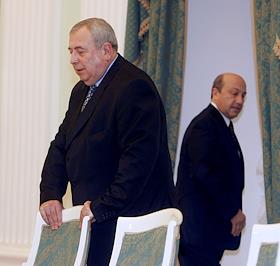 Руководитель Федерального агентства по атомной энергии Александр Румянцев (слева) и секретарь Совета безопасности России Игорь Иванов (справа) во время встречи Президента России Владимира Путина с секретарем Высшего совета национальной безопасности Ирана Хасаном Роухани в Кремле.
