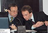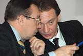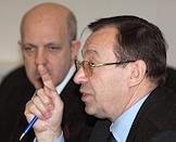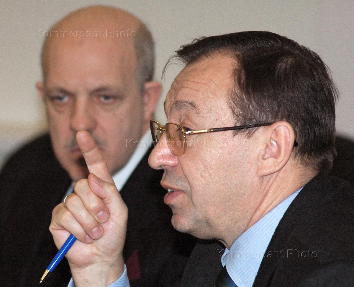 Председатель Комитета Торгово-промышленной палаты России (ТПП) по развитию потребительского рынка, генеральный директор Московской международной бизнес-ассоциации Александр Борисов (слева) на пресс-конференции, в рамках которой был представлен аналитический доклад "Современное состояние потребительского рынка России", подготовленный комитетом ТПП России по развитию потребительского рынка.