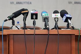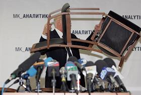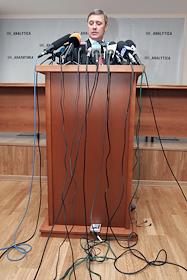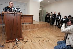 Подготовка к началу пресс-конференции бывшего председателя правительства России Михаила Касьянова в бизнес-центре.