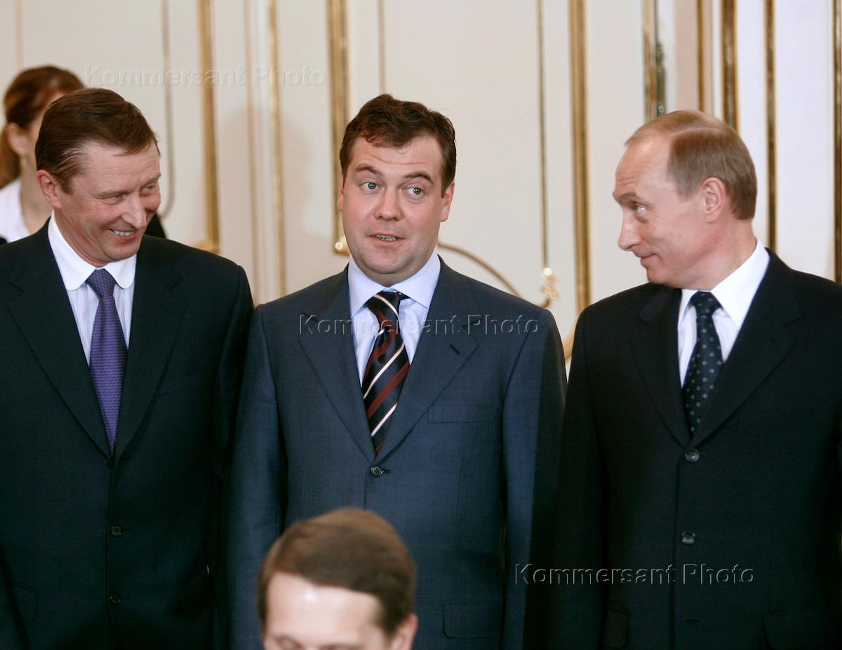 Президент России Владимир Путин (в центре), министр обороны России Сергей Иванов (слева) и руководитель администрации Президента России Дмитрий Медведев (справа) во время саммита в Братиславе.